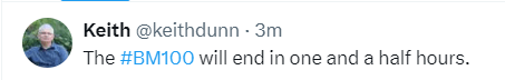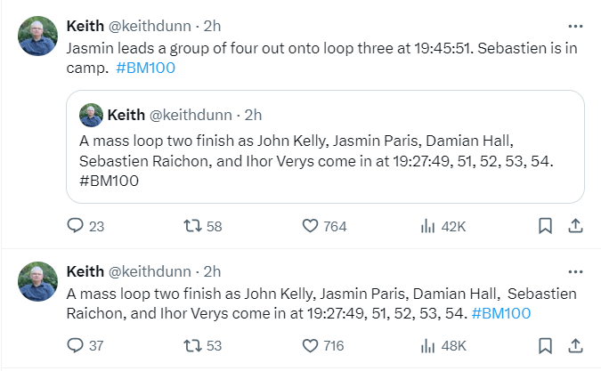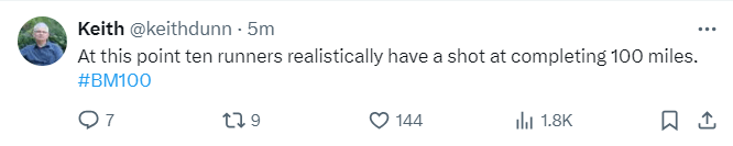 Selon Keith, à ce stade dix coureurs (dont une coureuse, donc) peuvent encore de manière réaliste imaginer terminer les 100 miles. Nous pouvons imaginer qu’il s’agit de Jasmin Paris, John Kelly, Damian Hall, Ihor Verys, Sébastien Raichon, Albert Herrero Casas, Greig Hamilton, Jared Campbell, Maxime Gauduin et Tomokazu Ihara.