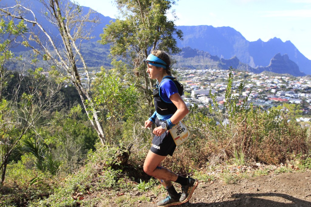 En dehors de cette douleur réveillée trop tôt les coups durs ce sont accumulés. Au ravitaillement de Mare à Boue, après un peu plus de 50km seulement, elle a tout simplement renvoyé le ravitaillement qu’elle venait de faire. Un moment difficile et de solitude, un moment qui peut faire basculer un ultra, qu’importe la place. « J’ai vomi tout le ravitaillement que je venais de faire, devant mon mari impuissant qui n’allait pas me revoir avant 8h du mat, puis dans la foulée il y a eu la montée à Kervegen avec la douleur qui se faisait bien sentir. Je n’étais vraiment pas confiante mais comme par miracle, souvent dans l’ultra, tout s’est amélioré petit à petit et dans la descente sur Cilaos je sentais que je pouvais à nouveau m’alimenter et que la douleur serait gérable pour un moment, » raconte-t-elle, « Ensuite je repars avec hâte d’attaquer les belles portions dans Mafate et me régale dans cette partie où je reprends beaucoup de temps et de places au scratch« .