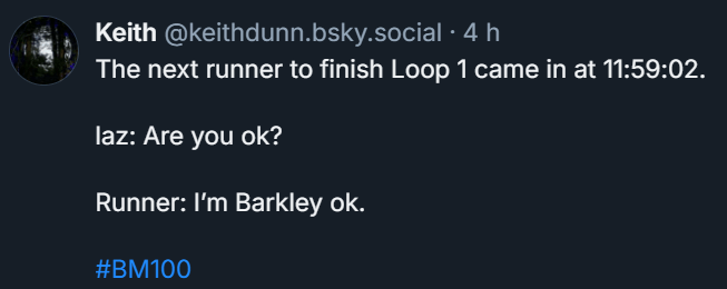 Restez connectés pour suivre les exploits des coureurs et découvrir qui rejoindra le cercle très fermé des finisseurs de la Barkley. Seront ici répertorier les informations qui traînent notamment celles diffusées par Keith Dunn (à suivre sur Bluesky ici : @keithdunn.bsky.social), celles postées sur ce tableur et celles qui passent sur les réseaux sociaux comme par exemple sur le média trail @territoriotrail.bsky.social.