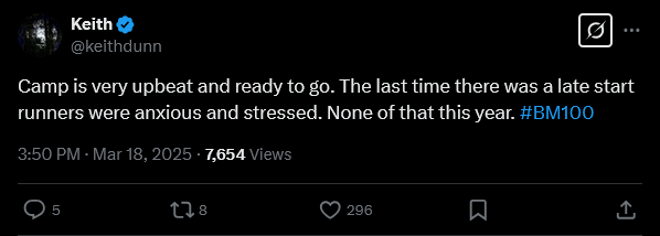 « Le camp est très optimiste et prêt à partir. La dernière fois qu’il y avait un départ tardif, les coureurs étaient inquiets et stressés. Rien de tout cela cette année. #BM100 »